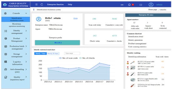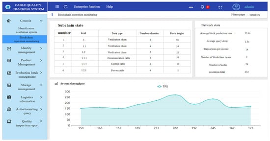 Coding is the premise and basis of product quality traceability. The coding information of cable products is printed on the cable product body and product certificate in the form of a QR code. According to the direction of cable product flow, the key quality data information generated by its production, testing, circulation, sales, and other links is assigned code associations. With a wide range of cable models and types, when tracing the quality of cables, not only does it require a large amount of data, but it also needs to ensure the authenticity of the data content. Therefore, a cable quality traceability system that integrates identity resolution and blockchain technology can provide a more transparent and trustworthy quality management process, ensuring the data’s trustworthiness and integrity and preventing it from being tampered with and falsified. Participants can track cable production and supply chain quality information through identifiers to ensure that cables comply with standards and specifications. Its structural framework is shown in Figure 8.