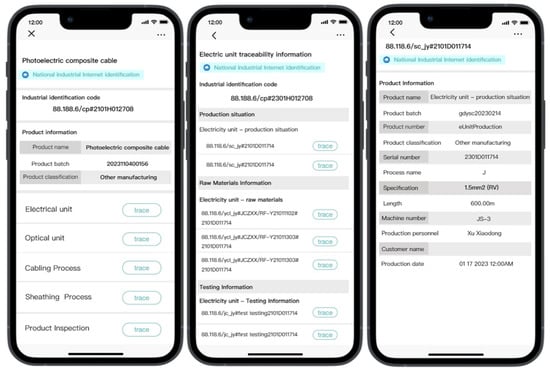 Mobile users enter the traceability management page by scanning the QR code of the products. Figure 16 shows the process traceability diagram of the photoelectric composite cable and the production information traceability of its electric unit. Figure 17 shows the batch and detail diagram of the photoelectric composite cable’s procurement receipt and storage stage. Identity authentication through different port access enables enterprises to trace the identity data for controllable open, and different users can scan the code to obtain cable products in the storage of relevant information in the block. The key fusion of identity resolution and blockchain enables enterprises to record the whole process data information of a batch of products in data management, which can be displayed in the product template.
