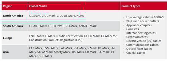 Product quality and safety is an important business basis for enterprises. There are many types of wires and cables, and according to the different uses, there are some differences in the manufacturing process and quality standards. Each industrialized country has also introduced the corresponding quality testing standards [33,34]. For example, ANSI/UL 9990, the Information and Communications Technology (ICT) power cable standard released in July 2023, was identified as the U.S. national standard for ICT power cable assemblies. ANSI/UL 9990 certified ICT cable assemblies can be affixed with the UL mark on product packaging, which increases consumer confidence and allows them to identify UL-certified ICT power cable assemblies. As shown in Figure 18, these are the entry-mark requirements for major global markets for major cable products.