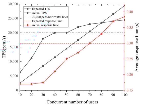 As shown in Figure 20, the actual average response time and Transactions Per Second (TPSs) of the system reach the expected value before the number of concurrent users reaches 70, and part of the TPS reaches more than 20,000 strokes/s. After the number of concurrent users exceeds 70, the actual response time and TPS of the system cannot reach the expected value, but the TPS of the system reaches more than 20,000 pens/s, and the actual response time is within the preset range. The experimental data show that the system has a sensitive response time and high throughput, and meets the expected standards in terms of performance, which in turn realizes such functions as timely response to decision-making commands and powerful data processing, and improves the robust performance of the system to a greater extent.