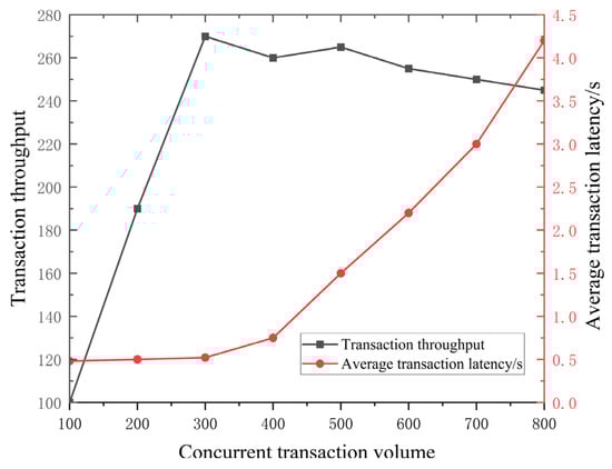 For the blockchain module, the “Hyperledger Fabric 2.5” has a field for setting block parameters, setting the number of transactions that can be accommodated as 100, the block size as 16 MB, and the time interval between blocks as 2.5 s. Caliper, a blockchain performance testing tool, is used to track the performance of the blockchain in real-time, and TPS and latency are chosen as the system’s performance testing indexes here. Design 8 performance test experiments, using Caliper custom script to initiate transactions to the system, each round of transactions concurrently 1000 times, a total of 8000 times, the number of transactions, and latency of the experiments to record and calculate the success rate of transactions. The transaction throughput results and average transaction latency are shown in Figure 21.