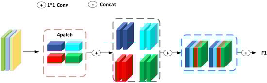In the first branch, the process begins with fine-grained feature extraction from the downsampled image, leading to the generation of Feature 1. This extraction, as detailed in Figure 3, starts by dividing the image into four blocks. Each block undergoes a specialized 1 × 1 convolution process, utilizing 32 filters. These filters are complemented by a ReLU activation function and a stride of 1, optimizing the extraction process. The output from each block is a feature map, which are then concatenated along the spatial dimension. This concatenated map undergoes a further transformation through a 1 × 1 convolution with 128 filters, same padding, and a stride of 1, effectively restoring the dimensions of the combined feature map. This restored map is then processed through two sequential Conv2D layers, each employing two 3 × 3 convolution kernels with a stride of 1 and 32 filters. These layers are followed by a 2D average pooling, a batch normalization layer to expedite convergence, and a Mish activation function layer, further refining the feature extraction. The process concludes with a downsampling layer, producing a refined feature map designated as f1.