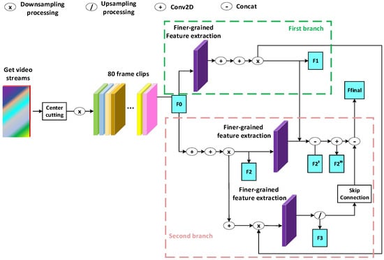 The second branch initiates with F0 undergoing feature extraction through two Conv2D layers, followed by a downsampling step to obtain feature map F2, as detailed in Figure 4. Subsequently, the network pathway behind F2 splits into a main branch and an auxiliary branch. In the −main branch, F2 is processed through a fine-grained feature layer, transforming it into F2′. This new feature map, F2′, is then concatenated with F1 in the channel dimension and further processed through a Conv2D layer, resulting in F2″. Concurrently, in the auxiliary branch, F2 first passes through a Conv2D layer, followed by a downsampling layer. After skip concatenation with F1, it undergoes another round of fine-grained feature extraction. This is followed by an upsampling layer employing bilinear interpolation, which yields feature F3. Finally, F3 is concatenated with F2″, culminating in the final feature, F_final. This intricate process, where features from different convolutional depths are fused, encapsulates a richer array of local and global information. This comprehensive fusion significantly enhances the model’s capability to understand and interpret images, leveraging the unique strengths of each convolutional layer and processing step.