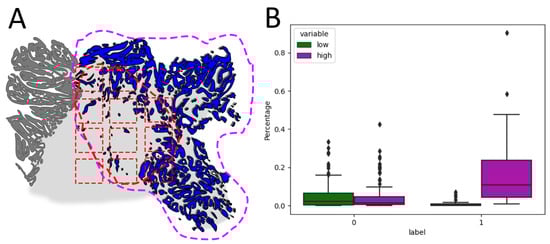 Region definition and distribution of informative tiles per case. (A) Sketch of WSI with annotated tumor region and border region. Based on a trained U-NET model the whole slide images are segmented into non-tumor (grey) and tumor (blue) tissue. The latter is subdivided based on the tumor content in each tile into tumor central (dashed line in magenta) and tumor border (dashed line in red). The tiles per region (exemplarily shown red dashed boxes) are then saved. For a graphic workflow of the tile preparations see Figure S3. (B) Boxplot for the frequency of meaningful instances per case. The MIL approach approach gives a class probability per instance or image tile. Per WSI, there are only a few instances with high class-probabilities. These few instances are the meaningful ones per case. The frequency of these meaningful instances per case is variable. The instances highly informative for nodal negativity are termed “low”, while those with significant relevance to nodal positivity are termed “high”. WSI: whole slide image; MIL: multi-instance learning.