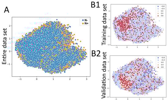 L-space analysis. Based on a PCA analysis of MIL results, for each instance a feature vector is plotted in 2D. (A) Instances from the entire data set, comprising the training and validation set, are plotted. The nodal status (nodal negative (N−) or positive (N+)) is used as a label. The silhouette score, as a clustering metric, is 0.008, which indicates a high overlap of the clusters based on the case labels. (B) Instances from the training set (B1) and the validation set (B2) are plotted. The label used involves the information gained concerning the nodal status. The MIL model produces a pseudo-probability per instance for the nodal status, which ranges between 0 and 1. For this plot, this range is stretched between −1 (low probability for nodal positivity and vice versa, therefore highly predictive for nodal negativity; here called “low”) and +1 (high probability for nodal positivity; here called “high”). For (B1) the silhouette score is 0.008 and respectively for (B2) −0.082. PCA: principal component analysis; MIL: multi-instance learning.
