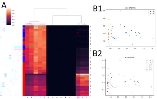 Training a MIL model using the random query approach for data augmentation, a maximum accuracy of 0.762 and 0.721 can be achieved for the validation set, based on features from ResNet152 and HistoEncoder, respectively (compare Table 2). Per instance per bag, the N+ probability can be calculated. By doing so, image tiles can be found being informative for nodal negativity, henceforth termed “low” for being predictive for N− and, respectively, adding low risk for N+. If not, a tile might be informative for N+, henceforth termed “high” for being highly predictive for N+ (compare B in Figure 1). A mean 17.339% of the image tiles in nodal positive cases are informative for nodal positivity (N+). However, in nodal negative cases (N− cases), there are still 4.494% tiles with high probability values for nodal positivity. In summary, the predictive reliability of the used MIL model for the feature vectors per tile produced by a pre-trained network (either ResNet or HistoEncoder) is better than for models trained on the noisy tile-level (compare Section 3.1 above). Of note, in the penultimate layer, the MIL model also summarizes the given information or respectively the fed in feature vectors in its own feature vector. Visualizing the distribution of these feature vectors again in the latent space by PCA reveals a much clearer separation for the trained classes (visualized in B1 with the class labels and in B2 with the class pseudo-probabilities (in analogy to Figure 2) in Figure 3). Furthermore, a cluster map analysis (A in Figure 3) reveals that half of the features produced by the MIL model are non-informative in regard to the given task.