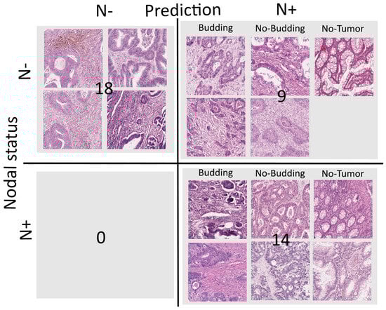 For the data set used here, a chi-square analysis shows a strong correlation between the tumor budding score (as described above and assessed based on an outdated system) and the nodal status (p-value < 10 × 10−8). In addition to this correlation, we tested the predictive power of the budding score per case. Therefore, the same splitting into a training and validation set as for the above-described MIL approach is used. By doing so, a logistic regression model trained to predict N− and N+ based on the budding score per case has an accuracy of and an AUC of for the validation set (compared to the AUC-values for the MIL approach in Table 2). Despite these prognostic capabilities, the budding score is not an independent parameter in the outdated system. For the used data set, there is a strong correlation between the expert-based tumor budding score [47] and the at this time used 3-tired tumor grading [48] per case. In the chi-square test, the p-value is also <10−5. Thus, tumor budding is not independent of tumor grading. Testing the grading as a predictive marker for nodal status using again a logistic regression model results in an accuracy of and an AUC of for the validation set. In conclusion, the predictive power of grading for the nodal status seems comparable to tumor budding. In summary, the budding score in this data set is not an independent marker but harbors a predictive power. Utilizing the metrics employed (namely accuracy and AUC) to assess the predictive reliability of the tumor budding score and the previously outlined MIL approach, both exhibit comparability (compare Section 3.3 above). Besides the comparable prediction quality, both approaches show similarities in other respects so that it can be argued that the same features underlie them. From the false predicted cases in the validation data set, six cases are false in both models. Looking at the budding score values in the wrong predicted cases for both models, the MIL model and the logistic regression model, the assigned budding scores have a median of 3 (compare Figure 4. Thus, these cases show a high budding score, known as being predictive for nodal positivity, albeit both are nodal negative. The location of the relevant image tiles is also an argument that tumor budding is the underlying feature. Looking at the location of the most predictive image tiles per N+ case, of these tiles are in the border region and are in the central tumor regions. Of the N− cases are in the tumor border region and are in the central regions (compare B in Figure 4). Since tumor budding is defined as taking place in the border regions, this can be used as an argument that the model at least recognizes similar features in the image.