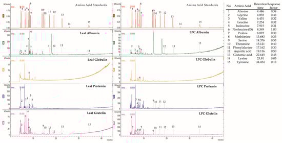 Nonetheless, the amino acid compositions of the glutelin fractions of flour and LPC were superior to those of the other fractions. In fact, the glutelin fractions contained five essential amino acids, including valine, leucine, isoleucine, phenylalanine, and tyrosine. These essential amino acids met the recommended levels outlined by the WHO/FAO (2007) for adults []. In contrast, the albumin and prolamin fractions presented insufficient levels of essential amino acids. Unexpectedly, the glutelin fractions (flour and LPC) displayed a higher total amino acid (TAA) content than did the protein hydrolysates obtained by enzymatic hydrolysis with pepsin (37.4 g) and pancreatin (43.8 g) in previous investigations []. Notably, the protein hydrolysates did not contain tyrosine. In contrast, the glutelin protein fractions showed a concentration similar to that of LPC (3.41 g), suggesting that some amino acids may not be released entirely during enzymatic hydrolysis. These findings emphasise the effectiveness of protein fractionation from the leaf or LPC, which could be a convenient and time-efficient method for obtaining high-quality protein fractions.