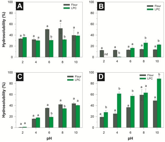 Hydrosolubility of protein fractions of jackfruit flour and LPC (Leaf protein concentrate) at different pH values. (A) Albumin, (B) Globulin, (C) Prolamin, and (D) Glutelin. Different letters indicate significant (p < 0.05) differences between the flour and LPC fractions at the same pH.