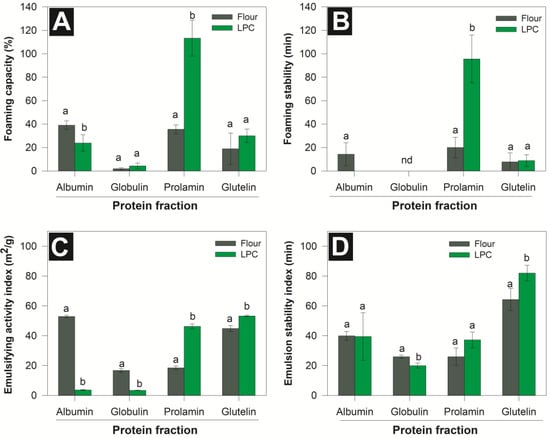 Emulsifying and foaming properties of protein fractions of jackfruit flour and LPC (leaf protein concentrate) at pH 7.0. (A) Foaming capacity, (B) foaming stability, (C) emulsifying activity index, and (D) emulsion stability index. Different letters indicate significant (p < 0.05) differences between the flour and LPC fractions.