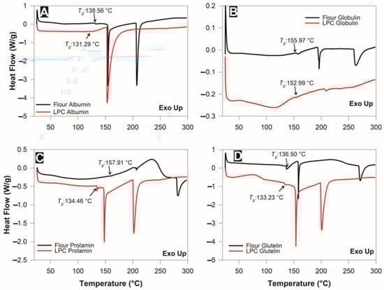 Differential scanning calorimetry (DSC) analysis of protein fractions of jackfruit flour and LPC (leaf protein concentrate). (A) Albumin, (B) globulin, (C) prolamin, and (D) glutelin. Tg: transition glass temperature.