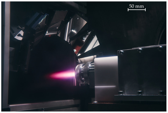 As stated in the previous section, a DC plasma torch (described in Section 2.1.1) operated at about 20 mbar was used as a test object for the proposed setup. In order to minimize possible influences on the gas flow caused by the chamber walls, the plasma torch was mounted in a vacuum chamber with a volume of about 0.77 m3. A Duo 120 A rotary valve pump and a PCR 260 pressure sensor with matching controller, all from Pfeiffer Vacuum, Asslar, Germany, were used to evacuate the chamber. The vacuum pump has a volume flow of 120 m3/h.