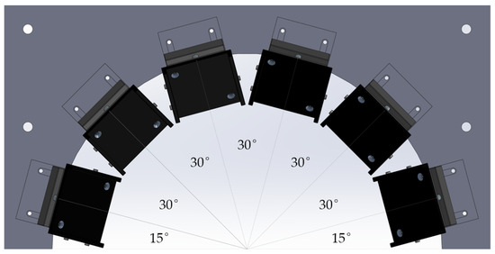 The mirror arrangement was offset by 15° from the horizontal plane. All deflection mirrors were manufactured by Edmund Optics Inc., Barrington, NJ, USA with an enhanced aluminum coating with an average reflectance of >95% at 450–650 nm at an angle of 45°. The surface flatness amounted to 4–6 λ and the surface quality to 60–40. The six small ones had a size of 50 mm × 75 mm and the larger one had a size of 250 mm × 350 mm.