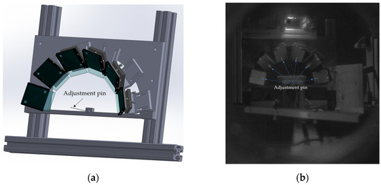 Tomography assembly with adjustment pin: (a) CAD drawing; (b) recorded image of the pin after adjustment of the mirror assembly.
