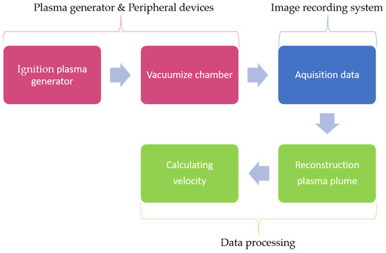 Figure 8 shows the basic process flow of the experiment. The first step is the ignition of the plasma generator. Once the plasma plume is stable, the vacuum pump is turned on. After reaching a constant vacuum level of about 20 mbar, the data acquisition is initiated. Afterwards the data processing starts, as described in the next section.