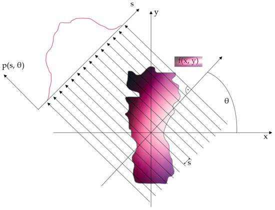According to the above, the recorded projections of the object under study from each angle of view (with ) are the radon transforms . The straight line can be described as follows, where is perpendicular to [33,34],
