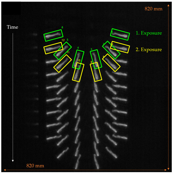 As can be seen in Figure 10, nine exposures were recorded on a single image of the high-speed camera. The temporal sequence of exposures goes from top to bottom of the image, with an interval of 10 µs between each exposure. The first and the second exposure with their appropriate six viewing directions are marked with green and yellow boxes respectively.