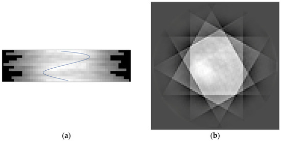 (a) Resulting sinogram with marked blue sine wave; (b) cross-sectional image of one line of all directions of view from Figure 11.