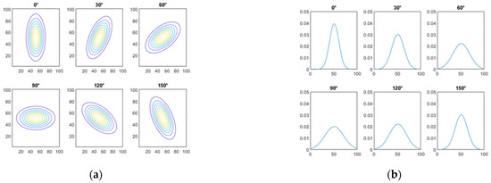 (a) Coordinate transformation of a bivariate normal distribution to simulate the directions of view (0–150°); (b) according to radon transforms of the bivariate normal distributions with the viewing direction positioned along the bottom axis.