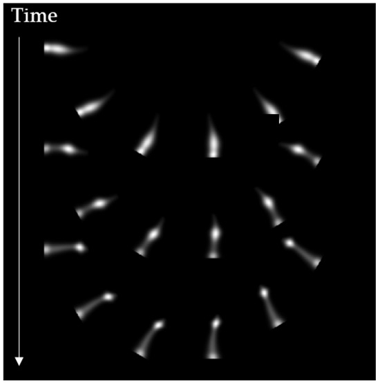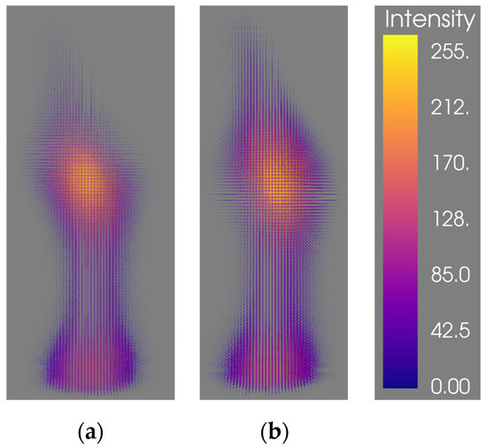 The idea was to create a three-dimensional model based on several layers, which have been generated by the Equation (6). The amplitude of the density function represents the brightness, and the shape of the model can be adjusted by the expectation and the standard deviation . The brightness value has been normalized and the emission distribution of the model can be modified using a desired additional function for scaling the value. For receiving the six directions of view from the simulated three-dimensional model, a radon transformation was performed from each perspective for each layer. Based on the known output functions, a coordinate transformation over the angle has been calculated, which represents the according radon transform for the angle .