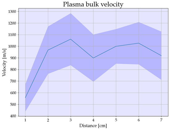 The graph in Figure 16 shows the calculated plasma bulk velocities along the axis of the generator at a distance of 1 cm to 7 cm downstream of the nozzle outlet. The blue-shaded area around the line in Figure 16 marks the standard deviations of the velocity results, which were about 20%. According to the graph, the plasma bulk accelerates to about three centimeters from the nozzle outlet, where an average velocity of 1061 m/s is reached. Further downstream, the velocity decreases slightly and reaches a mean value of 919 m/s at seven centimeters, with a small dip in the curve at four centimeters.