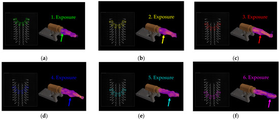 Calculated 3D models of the plasma plume at six different points in time: (a) first exposure; (b) second exposure; (c) third exposure; (d) fourth exposure; (e) fifth exposure; (f) sixth exposure.