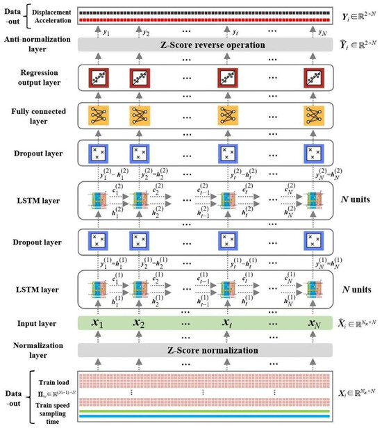 In order to predict the train-induced dynamic responses of a railway bridge, this paper establishes a LSTM deep neural network structure. This network structure includes normalization layer, data input layer, LSTM layer, dropout layer, full connection layer, regression output layer, denormalization layer, etc. Taking the two-layer stacked LSTM network as an example, the neural network model architecture is shown in Figure 3. In order to eliminate the dimensional influence between different input data and avoid the problem of gradient explosion, it is necessary to standardize the data to solve the comparability between data indicators and improve the speed of gradient descent and convergence. After the original data are processed by data standardization, each metric is in the same order of magnitude, that is, normalization. Given the uncertainty surrounding the train load impacting the railway bridge, the resulting vehicle-induced dynamic response data exhibit a degree of discreteness with indistinct boundaries. Consequently, the Z-Score method is employed to normalize the model data. The specific content of this method is to calculate the mean value μ and standard deviation σ of the data sample, and then map the data to the normal distribution. Finally, the standardized data and with the same input parameters at each time step conforming to the standard normal distribution (mean value is 0, standard deviation is 1) are obtained, as shown in Equation (21):
