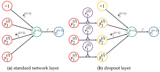 To enhance training efficiency and mitigate overfitting, it is common practice to incorporate a dropout layer following the LSTM layer [22]. The fundamental concept involves randomly disconnecting neuron connections during training and discarding nodes from the connection layer at a specified dropout rate. This process reduces training parameters, accelerates training speed, and prevents excessive sensitivity to particular cue fragments. Consequently, it diminishes the complex cooperative adaptation among neurons and enhances the model’s generalization capability. In scenarios with limited data, feature discrimination can be augmented through sparsity. The operational mechanism of dropout technology is illustrated in Figure 4.