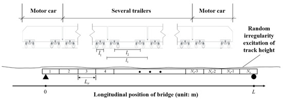 The German Intercity-Express (ICE) multiple unit train, comprising two power cars and several trailers, is taken as the research object. The power cars are positioned at the front and rear of the train, while the trailers are situated in the middle. The axle spacing dimensions of both the trailers and power cars in each train formation are standardized, ensuring consistent fixed axle spacing l1, vehicle pitch l2, and car body length l3 within the same train. The individual axle loads of the power cars and trailers are 16 tons and 14.6 tons, respectively. The vehicle pitch l2 is 17.375 m, and the length of the carriage l3 is 24.775 m. The German low-disruption track vertical irregularity spectrum is employed as the input excitation. The spatial frequency Ω ranges from 0.05 to 3 rad/m. The random spatial frequency is 500. The layout of the train, track, and bridge system is illustrated in detail in Figure 5.