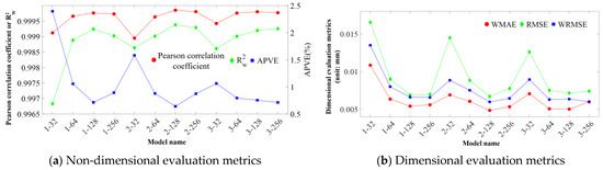 The performance of different LSTM network models, as listed in Table 2, for the prediction of railway bridge displacements are compared. The dimensional and non-dimensional evaluation metrics were applied to assess the prediction accuracy. Results are presented in Figure 8. Non-dimensional metrics include Pearson correlation coefficient, the weighted coefficient of determination , and APVE. Dimensional metrics include WMAE, RMSE, and WRMSE.