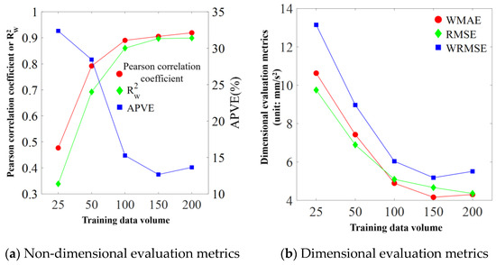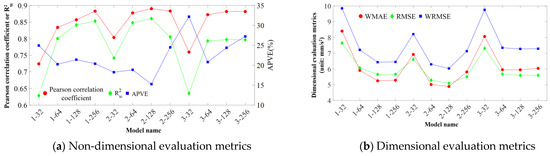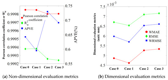 Upon introducing weights, the MAE, MSE, RMSE, and R2 are, respectively, represented as the weighted absolute error (WMAE), weighted mean squared error (WMSE), weighted root mean squared error (WRMSE), and weighted determination coefficient (). The calculation of the weighted metrics can be performed according to Equations (29)–(32):