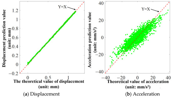 The evaluation metrics of the predicted displacement and acceleration under different noise cases are shown in Figure 20 and Figure 21. The results show that the Pearson correlation coefficient and decrease obviously with the noise included. The decrease of the evaluation metrics of displacement is smaller that of the acceleration. Specifically, the Pearson correlation coefficient and of displacement prediction stay above 0.999, while those of acceleration decreased by a large margin, but still remained above 0.8. This indicates that the predicted values of displacement and acceleration with limited input noise always have a strong correlation with the theoretical values.