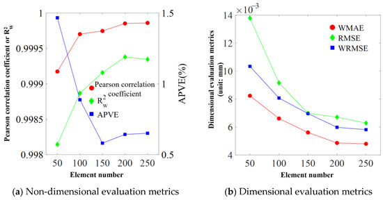 The evaluation metrics of predicted displacement and acceleration for Ne, ranging from 50 to 250, are depicted in Figure 15 and Figure 16. The results indicate a gradual increase in both the Pearson correlation coefficient and with the increased Ne, suggesting an enhanced correlation between predicted and theoretical values. Furthermore, APVE demonstrates a downward trend in error values as Ne increases. The dimensional evaluation metrics exhibit a declining trend as Ne increases from 50 to 150. However, the rate of decline becomes slightly more moderate when Ne increases from 150 to 250. Hence, the optimal Ne in this study is determined to be 150, with the corresponding length of the bridge element set at 0.21 m.