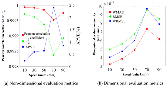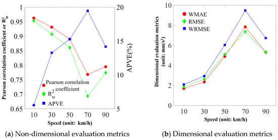 The evaluation metrics of predicted bridge displacement and acceleration with the varying train speed are depicted in Figure 17 and Figure 18. The results indicate that the Pearson correlation coefficient and for displacement prediction remain consistently high, with values exceeding 0.998. For acceleration prediction, the Pearson correlation coefficient and range between 0.7 and 0.95. The APVE values for displacement prediction range from 0.2% to 2.5%, while those for acceleration prediction range from 5% to 20%. In terms of dimensional indices, the displacement ranges from 0.003 mm to 0.01 mm, while the acceleration ranges from 2 mm/s2 to 10 mm/s2. Additionally, one can observe that all the evaluation metrics show mutation and obvious deterioration when the train speed reaches 70 km/h. The cause of this phenomenon may be the resonance effect in the vehicle–bridge coupling vibration [31].