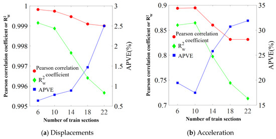 Based on the previous analysis, the performance of predicting the train-induced bridge responses with a varying number of carriages will be discussed in this section. Figure 19 shows the non-dimensional metrics for evaluating the prediction performance of the displacement and acceleration of a railway bridge as the number of carriages varies from 6 to 22. The riding speed of the train is set as 50 km/h. The results show that the increase in the carriage number causes a similar changing trend with the train speed. To be specific, the increase in carriage number leads to a decrease in prediction accuracy. The error level of displacement prediction is relatively stable, and the acceleration prediction is more sensitive to the change in train sections.
