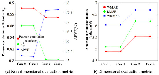 Regarding APVE, both the evaluation metrics for displacement and acceleration increase after adding noise, with the maximum increase being approximately 0.1% and 2%, respectively. In terms of dimensional indicators, each evaluation metric shows an increase after noise addition, but the increase in acceleration evaluation metrics is greater than that of displacement. This suggests that acceleration prediction is more sensitive to noise compared to displacement prediction. Furthermore, transitioning from Case 0 to Case 1, or from Case 2 to Case 3, results in minimal changes in each metric. However, there is a noticeable variation trend in the evaluation indices between Case 2 and Case 3 compared to Case 0 and Case 1.