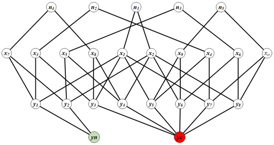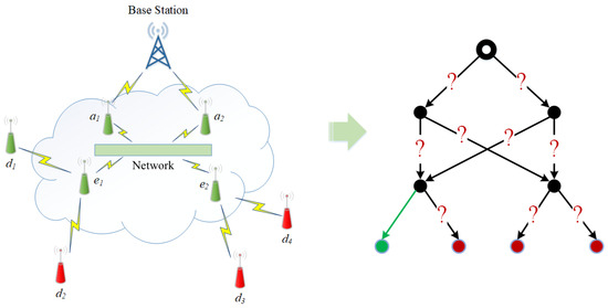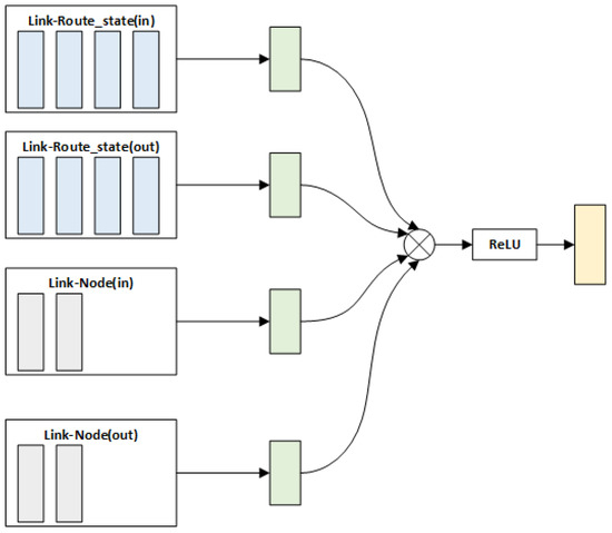 We constructed a graph for link congestion identification, where is the set of nodes in the graph and represents the set of edges in the graph. There are three types of nodes in . The first type of node represents the route status, the second type of node represents the link status, and the third type of node represents the node status in the network. There are two types of edges in . The edges between the link status nodes and route status nodes represent the routes which travel through the link, and the edges between the link status nodes and node status nodes represent the link starting from the node. We combined the route status node into two entities based on the test results. For example, if the test result is that the end-to-end path routes , , , , , and are congested, and and are not congested, then the graph structure is constructed as shown in Figure 5.
