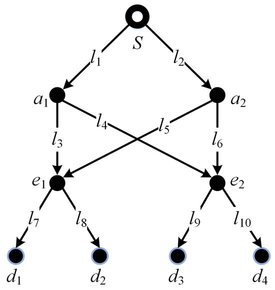 In adherence to the conventions established in [26], and with the aim of fostering a controlled environment which prioritizes simplicity and a keen focus on core concepts, we opted to employ a numerical simulation approach for validating our proposed method. Figure 3 shows the topology of the network designed for the experiment. There are nine nodes in this topology. Without loss of generality, we took node s as the source node and nodes , , , and as the destination nodes. In this topology, there are two routes between the source node and each destination node, and there are some shared links between different path routes, which partly reflects the complexity of the network.