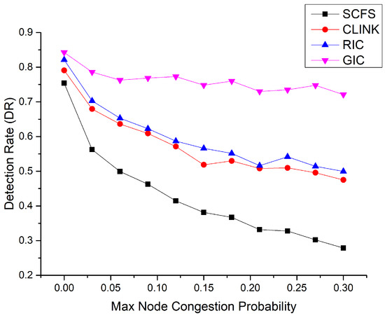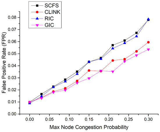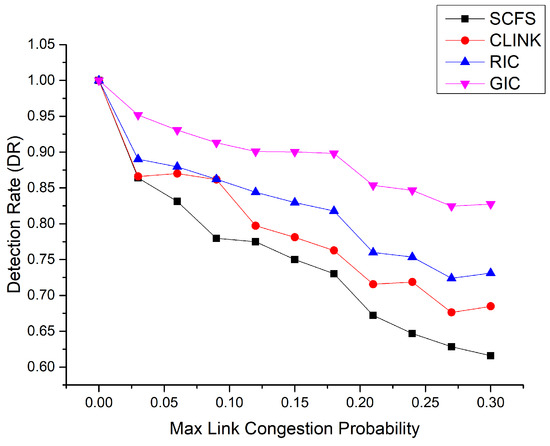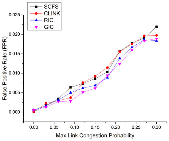 The results are shown in Figure 11 and Figure 12. As the channel cause congestion probability increased, the performance of all congested link identification algorithms degraded because as the number of congested links increased, the number of congested routes also increased. A large number of congested path routes would increase the number of feasible solutions, which increased the probability of errors in the identification algorithm. More importantly, as the network congestion level increased, the chance of multiple congested links in the same path increased, but the existing algorithms are all based on the presence of only one congested link, which reduced the DR of the algorithms. However, the performance of the FPR was not all that different, since the existing algorithms are conservative in the inference of congestion.
