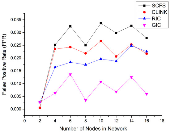 We systematically varied the network size by adjusting the number of nodes, denoted as N, which varied from 2 to 16, and observed the impact on the DRs and FPRs of the different methods. For each network size, we conducted multiple simulations by iteratively changing and from to with a step size of .
