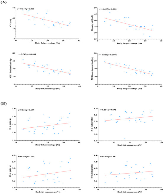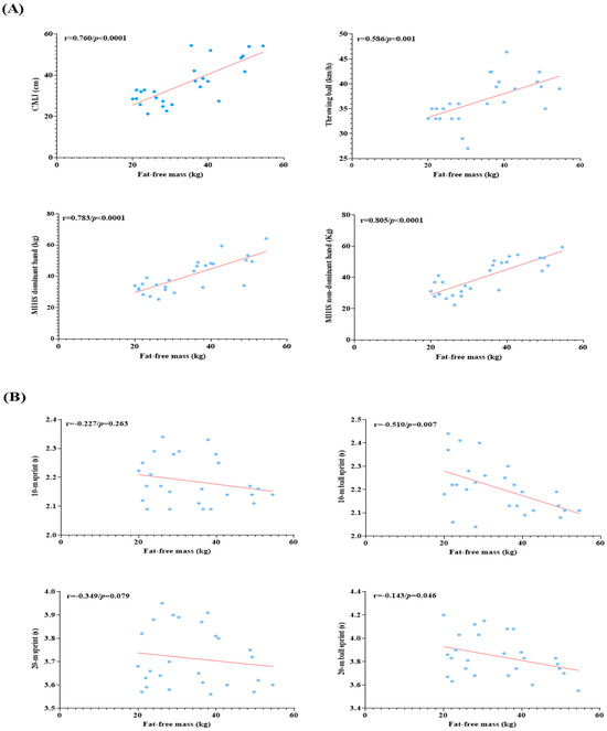 Figure 2A,B show the correlations between body fat percentage and physical performance in professional basketball players. A significant negative and large correlation was reported with CMJ (r = −0.647; p = 0.000; ES = 0.56, moderate effect), throwing a ball (r = −0.657; p = 0.000; ES = 0.58, moderate effect), MIHS dominant hand (r = −0.745; p < 0.0001; ES = 1.17, large effect), and MIHS non-dominant hand (r = −0.820; p < 0.0001; ES = 1.50, large effect). On the contrary, a no significant correlation in 10 m sprint (r = 0.261; p = 0.197; ES = 0.03, insignificant effect), 10 m with ball sprint (r = 0.214; p = 0.292; ES = 0.02, insignificant effect), 20 m sprint (r = 0.240; p = 0.235; ES = 0.03, insignificant effect), and 20 m with ball sprint (r = 0.204; p = 0.317; ES = 0.03, insignificant effect) with fat-free mass was reported.