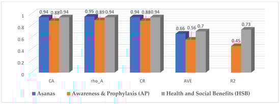 The study used SmartPLS to evaluate consistency using composite reliability, ensuring that the survey items were suitable for the research. All variables displayed high values, with Asanas explaining 45% of the variance of Awareness and Prophylaxis (AP), and AP variance explaining 73% of Health and Social Benefits (HSBs). The latent variable correlation showed a strong positive correlation between Awareness and Prophylaxis (AP) and Health and Social Benefits (HSBs), and a medium positive correlation between Asanas and Awareness and Prophylaxis (AP). The loading factors for all Asanas, AP, and HSB sub-items had values greater than 0.6, indicating the survey was well designed. The SmartPLS algorithm computed the variance inflation factor (VIF) of each construct, indicating no multicollinearity between the variables.