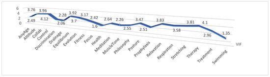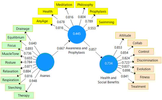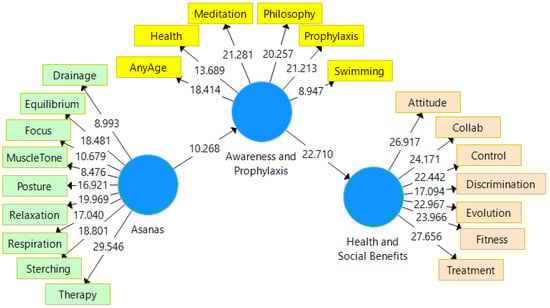 Variables—At this point, both the theoretical and the practical variables had been established, and scales had been chosen for assessing them, defining the knowledge-gathering approach, selecting the data acquisition device, and constructing the methodological framework to organize the information. The data were evaluated using the partial least squares (PLS) structural equation modeling technique, which analyzes simultaneous interactions among latent, formative, or reflecting variables even for smaller samples. Three latent reflective constructs (Asana type, Awareness and Philosophy, and Health and Social Benefits) are present in our model. All variables, with their descriptive items, are presented in Table 3.