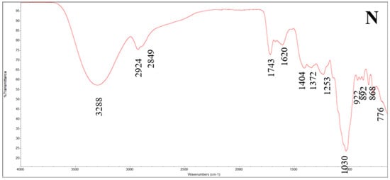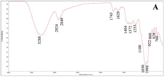 A peak at around 2924 cm−1 was found in all samples and could be attributed to the CH and CH2 stretching vibrations of galacturonic acid methyl esters, characteristic of the hydrocarbonated skeleton of the saccharide. According to Aslam et al. [63], the spectral regions between 2800 and 3000 cm−1, typical of CH2 stretching, could be associated with lipid and carbohydrate. The signal intensities for this region also reflected the sample profiles observed at 3288 cm−1: cucumber and parsnip peels showed the maximum and minimum signals, respectively. The peak at 2849 cm−1 is associated with the presence of carbohydrates and it was found only for mango peel, apple peel, and black plum peel. The peak at around 2898 cm−1 is associated with the –CH stretching vibrations, CH3 symmetric stretching, and CH2 symmetric stretching of carbohydrates. The signal at around 1740 cm−1, found in all samples, can be attributed to the C=O stretching vibration of the carboxylic acid methyl ester of the pectin [64]. Luca et al. [65] attributed this peak to beta carotene, and it is characteristic of samples with a high content of carotenoids.
