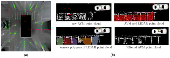 Example of parking space recognition. (a) Parking space corner points detection and parking space feature extraction for automatic valet parking []; (b) Parking space recognition and parking lot mapping based on Lidar [].