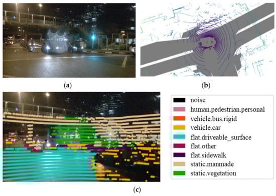 - Fong, W.K.; Mohan, R.; Hurtado, J.V.; Zhou, L.; Caesar, H.; Beijbom, O.; Valada, A. Panoptic nuScenes: A Large-Scale Benchmark for LiDAR Panoptic Segmentation and Tracking. IEEE Robot. Autom. Lett. 2021, 7, 3795–3802. [Google Scholar] [CrossRef]