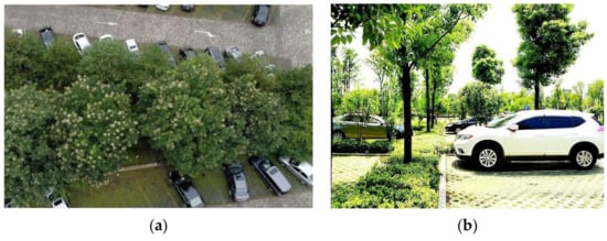 Modern ecological parking lots where parking lines cannot be detected. (a) Top-view image of a parking lot; (b) Image of an ecological parking lot.