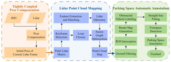 The method proposed in this paper is illustrated in Figure 4 and consists of three main components: tightly coupled pose compensation, Lidar point cloud mapping, and parking space automatic annotation. First, the collected Lidar data is combined with IMU data for pose compensation. Next, the Lidar odometry and keyframes are calculated to provide initial values for the compensated pose, constructing a three-dimensional point cloud map of the parking scene based on the polarized Lidar odometry and historical keyframes. Finally, the regions of interest (ROI) after filtering out the ground points are extracted from the three-dimensional point cloud map to generate a grid map. This grid map is then used to identify obstacle vehicles, detect free spaces, and mark available parking spaces.