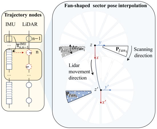 Mechanical Lidar detects the environment by rotating the laser emitter during data collection. Data is generally collected and stored in the form of equal-angle fan-shaped sectors  starting from the Y axis in a clockwise direction. For example, each laser frame contains 75 equal-angle fan-shaped sectors. The acquisition time for each fan-shaped sector in a Lidar frame with an operating frequency of 10 Hz is 1.33 ms. However, during movement, the vehicle carries the mounted Lidar along with it, resulting in an additional superimposed change in the Lidar’s movement direction besides the change in the scanning direction between the various fan angles in the laser scanning frame. As shown in Figure 5, after the superposition change of the scanning and movement directions, the fan angle  is transformed into  in the ego body coordinate system. IMU can output high-frequency pose data through dead reckoning (DR). Therefore, the pose-transformation matrix between adjacent Lidar frame nodes can be calculated by coupling the pose information output by IMU pre-integration []. The fan-shaped sector can then be compensated for pose using a timestamp-based linear interpolation method. The initial pose value of the current laser frame can be estimated by combining the pose of the previous laser historical keyframe.