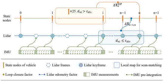 Feature extraction and matching across all frame nodes are time-consuming and resource-intensive, necessitating keyframe extraction. The method involves calculating the pose transformation between the current laser frame and the previous laser historical keyframe to determine if the current frame qualifies as a keyframe. This calculation includes determining the roll angle transformation , pitch angle transformation , yaw angle transformation , and translation transformation  between the current laser frame and the previous historical keyframe . When any of these transformations exceed their respective thresholds, the current laser frame  is designated as a keyframe. The newly identified keyframe  is linked to the new vehicle state node  in the factor graph, and all Lidar frames between the two keyframes are discarded. In our approach, the roll angle transformation threshold , pitch angle transformation threshold , yaw angle transformation threshold , and translation transformation threshold  are predefined.